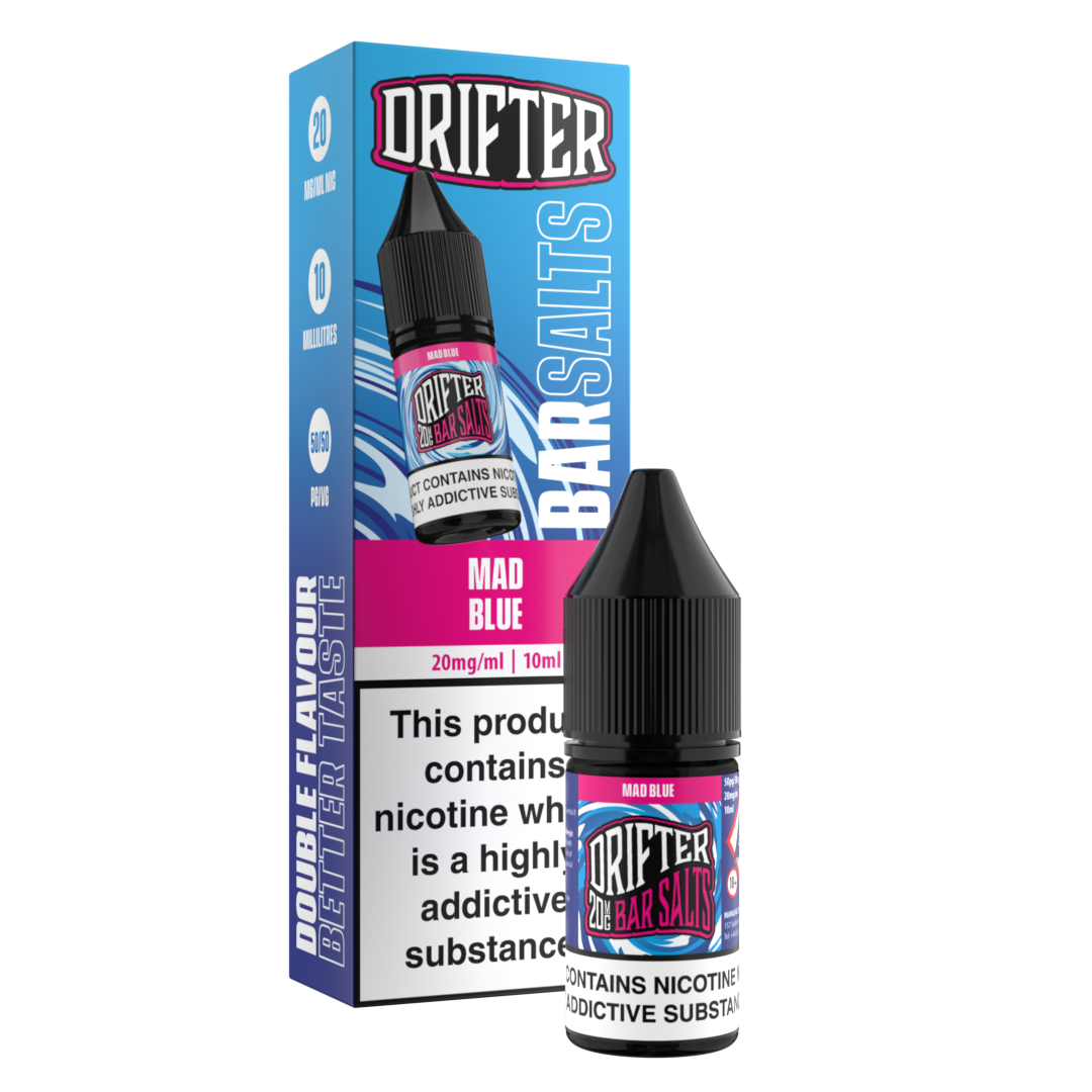 Drifter Bar Salts Mad Blue features a robust Blueberry flavour with a pronounced raspberry finish. It boasts five times the E-Liquid of a traditional disposable device, offering an outstanding value for money with the familiar taste of disposable devices. Available in 10mg and 20mg strengths, the Drifter Bar Salts range features 10 delectable variants with more to come. Each SRP contains 12 individually packaged E-Liquids and holds up to 3500 puffs. The 50PG/50VG blend ensures a smooth draw.